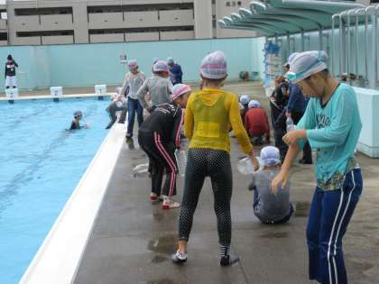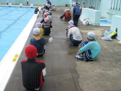 今日は、3年生から6年生まで着衣泳を実施しています。衣服を着ている状態では、水の重みを感じているようでした。ペットボトル等のご準備ありがとうございました。体験を通して学んだことをこれからに活かしてほしいと思います。