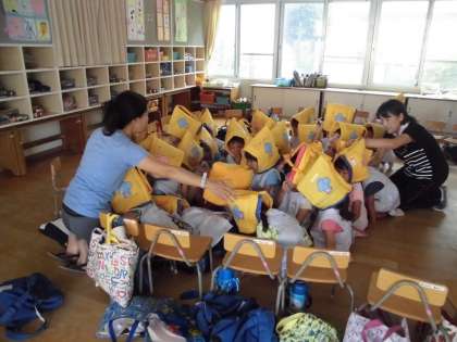 2.揺れがおさまりました。先生の所に集まりましょう。