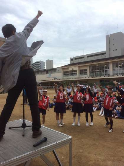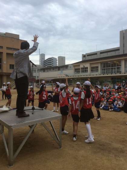 運動場か講堂か、グループ遊びの場所は、校長先生と班長さんとのジャンケンで決めます。