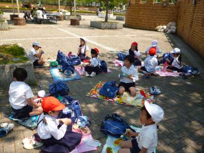 グループで動物園を仲良く見学した後は、おとなりの天王寺公園でお弁当を食べました。みんなで食べるお弁当はとてもおいしかったです。おやつを食べた後、いっしょに遊びました。天気にも恵まれ、よい遠足となりました。