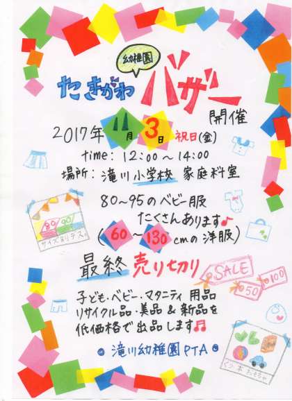 11月3日(祝)12:00〜14:00 滝川小学校家庭科室でバザーを開催します。