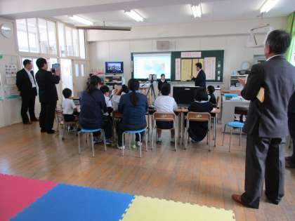 上:6年生教室とのびのび学級をskypeで通信した授業の様子
