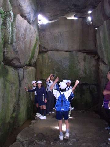 石舞台では、外観の大きさにおどろき、中に入ると、石の冷たさに、さらに歓声をあげました。石の間から差し込む木漏れ日が幻想的で、みんなでうっとりしました。
