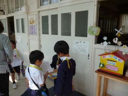5月2日(金)1・2年生が学校たんけんを行いました。講堂に集まって、回るときの諸注意をきいてから、1・2年生のグループで回りました。2年生は、それぞれ教室が何のために使われるかを説明しながら回りました。
