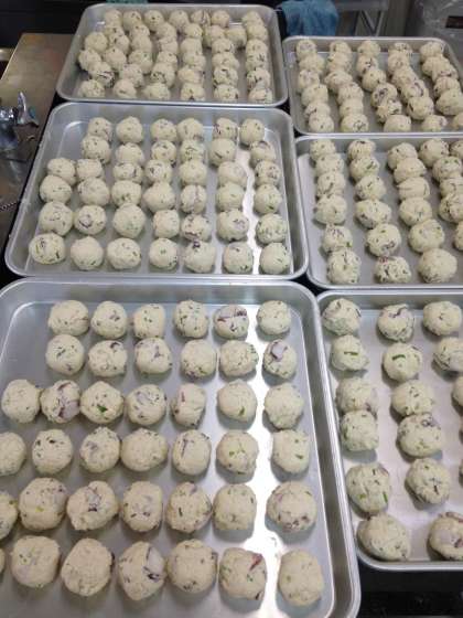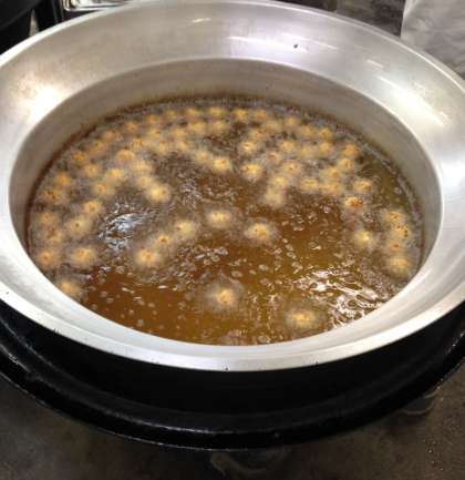 とうふや薄切りのたこの入った生地を1つずつ手で丸めて、油であげています。