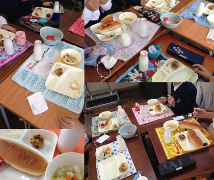 今日の給食は「コッペパン、いちごジャム、牛乳、たこボール、洋風煮、だいこんのピクルス」でした。