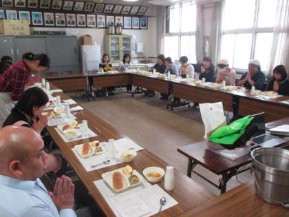 9日(木)にPTA給食試食会がありました。試食献立は「レーズンパン、牛乳、スープ煮、ほうれん草のグラタン、りんご」でした。