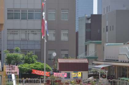 幼稚園ではこの日、子どもの日の集いがありました。小学校からは大きなこいのぼりと園児がつくったかわいいこいのぼりが見えます。