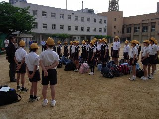薄曇りの早朝、出発式を行いました。校長先生より、たくさんの楽しい思い出を作りましょうというございつがありました。この後、2名の児童代表より「水族館でいろいろいな生き物を見たい」「磯観察でいっぱい発見したい」という発表がありました。