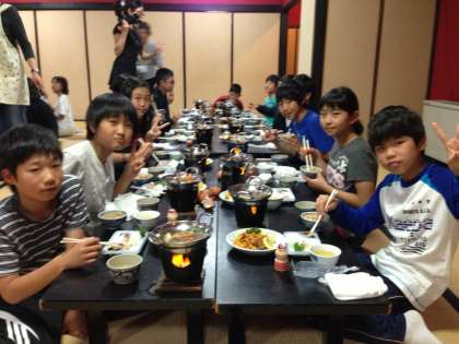 女将のきくさんから、すき焼きの食べ方をおしえていただきました。ごはんのおかわりも、たくさん用意してくださいました。おいしいです。