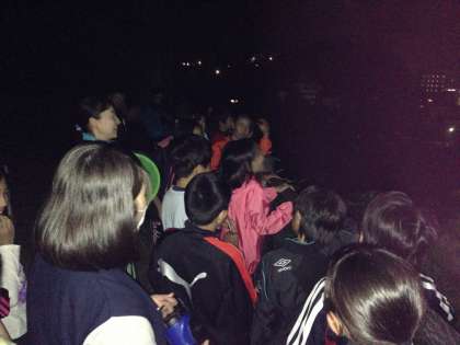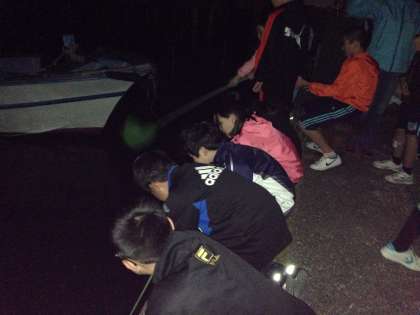夜光虫を必死で探しています!真っ暗闇の中、編みで海面に刺激を与えています!