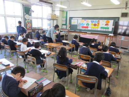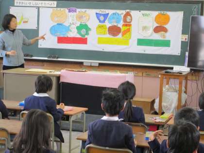 1年の栄養指導は「好き嫌いをしないで食べよう」というテーマで、給食に出てくる食べものを3つのなかまに分ける学習をしました。