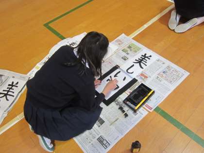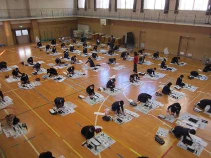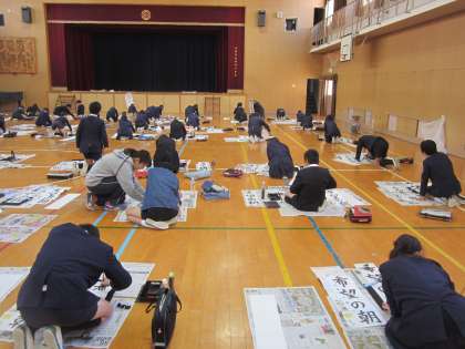 毎年恒例の書初め大会がありました。5.6年生は静まりかえった講堂で集中して筆を走らせていました。