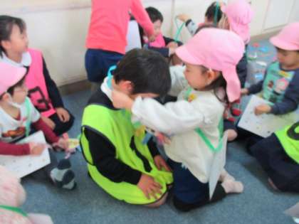 22日(木)2年生は、2時間目に滝川幼稚園さくら組さんをおもちゃランドへ招待しました。とてもていねいにやさしく言葉かけをしている男の子、遊び方をわかりやすく説明する女の子など、いつもとは違った景色が見えました。笑顔があふれる素敵な交流となりました。交流の最後には、さくら組の皆さんからお礼のメダルもかけてもらいました。