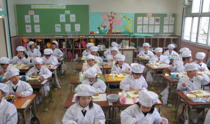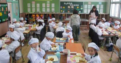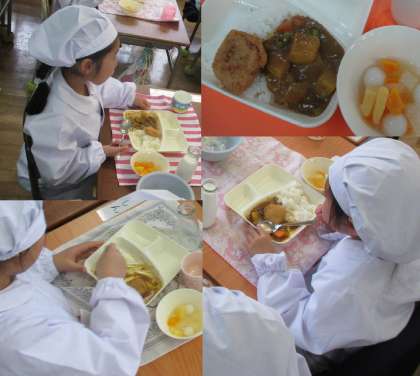 今日の給食は「カツカレーライス、牛乳、フルーツ白玉」でした。新1年生の入学と2〜6年生の進級をお祝いする献立で、どの学年ももりもり食べていました。