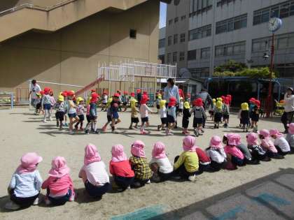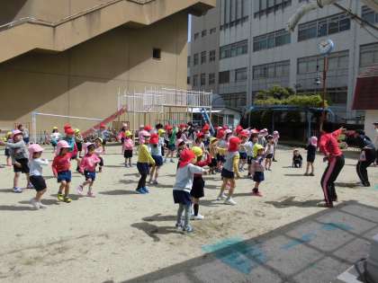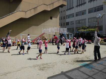4月16日(月) 園庭で集会活動をしました。みんなで歩いた後、どうぶつ体操をしました。