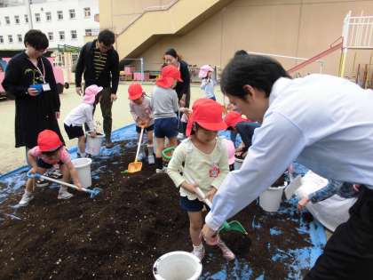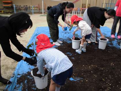 5月10日(木) 「ふれあい苗植え」をしました。おうちの人と一緒に、大きな植木鉢に野菜の苗を植えました。植えた後は、ていねいに水やりをしました。
