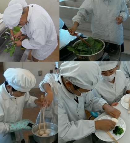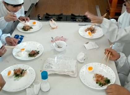 今日は家庭科の調理実習がありました。班のみんなで協力してゆで卵とほうれん草のおひたしをつくりました。