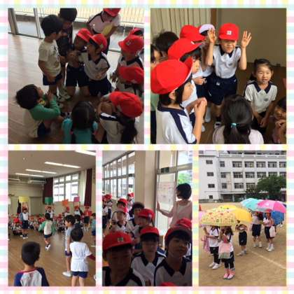1年生は、幼小交流のため、雨の中、歩いて幼稚園へ。