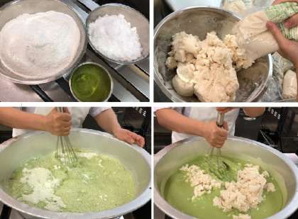まっ茶ういろうは、上新粉、砂糖、抹茶、白いんげんペーストに水を加えた生地を焼き物機で蒸しています。