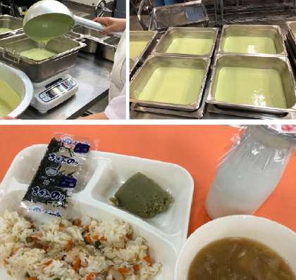 今日の給食は「かやくご飯、牛乳、みそ汁、まっ茶ういろう」でした。