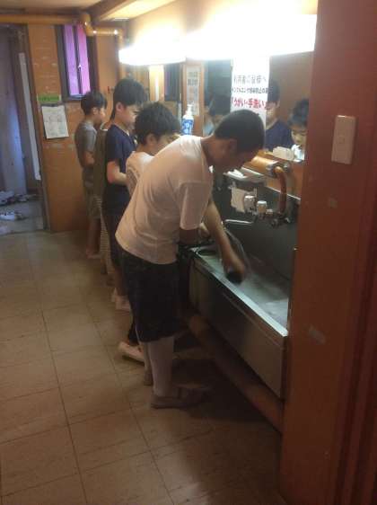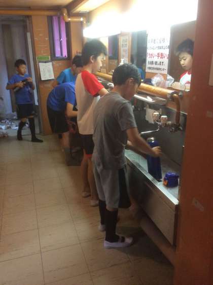 起床。洗面。水筒を洗います。