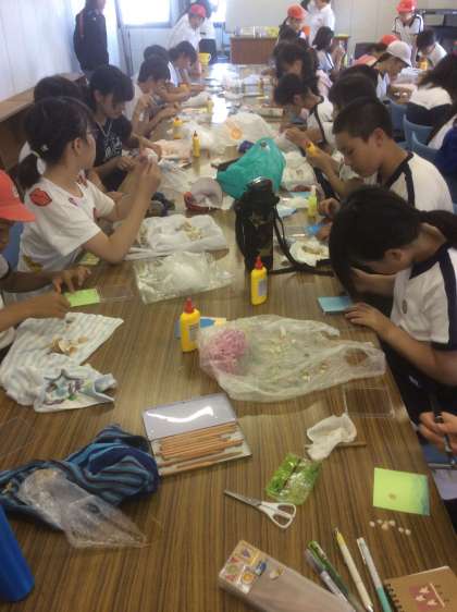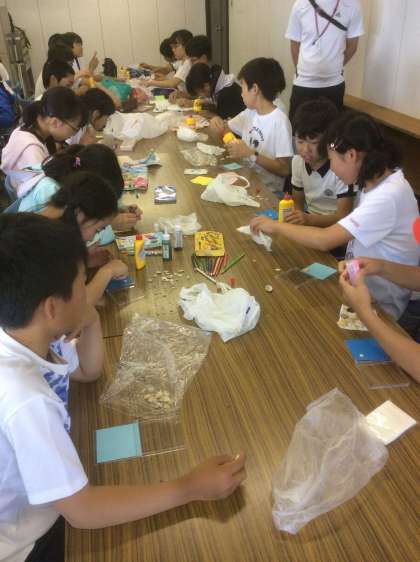 一昨日海岸で集めた貝殻を画用紙に貼っていきます。