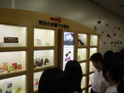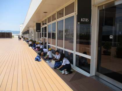 明治製菓では、キノコの山とたけのこの里の人気投票が行われていました。売上では、たけのこの里に軍配が上がるそうです。ちなみに子どもたちの投票では、2票差でたけのこの里でした。明治製菓の後、伊丹空港へ昼食を食べに行きました。あまりに天気がよく、しかも空港の屋上は改装工事の後、日陰部分がほとんどないという状態でしたので、建物のひさし部分にできたわずかな日陰に、一列になってお弁当を食べました。正面には飛行機の発着が見られ、なかなかよい眺めでした。
