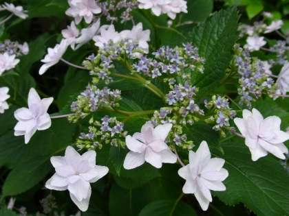 講堂入口前のアジサイの写真です。校舎に向かって右にきれいな赤紫のアジサイが、左には淡い青色のアジサイが咲いています。講堂の裏側には高さ3メートル近くまで成長した立派なアジサイがあります。