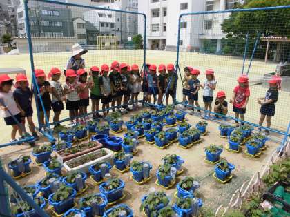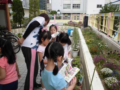 ばら組さんは、園庭に生えている草花の名前を図鑑で調べました。小学校にもおじゃまして調べました。
