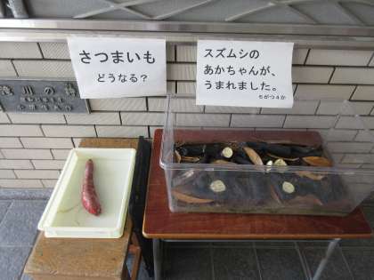 玄関では毎日観察できるように「さつまいも」と「すずむし」がまっています。今日はどんなふうに成長しているかな?