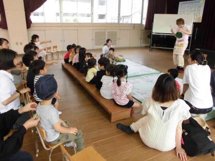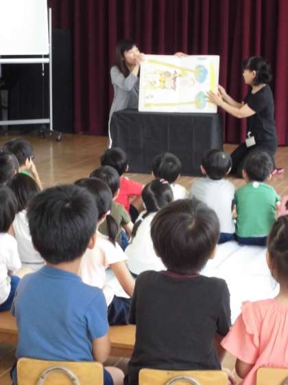 北区図書館ボランティアの方々が来て、本の読み聞かせをしてくださいました。大きな紙芝居もしてくれました。
