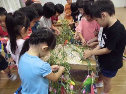 笹飾りも作りました。笹には、お願い事を書いた短冊やきれいな飾りをつけました。