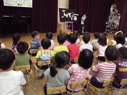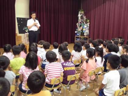 七夕の集いをしました。園長先生のお話を聞いた後、大海先生に七夕のお話をしてもらいました。