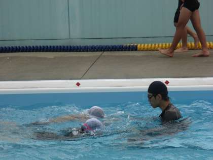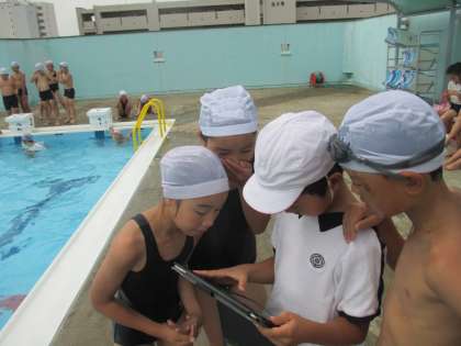 3・4年生は各々の泳力に応じて、ラッコ・イルカ・ペンギンの3コースに分かれて水泳の学習に取り組んでいます。今日は、見学のお友達に泳ぎの様子をタブレット端末で撮影してもらい、自分のフォームを確認しました。「思ったより腕が伸びていないな」「クロールの息継ぎで、耳がしっかりうでについているよ」など、自分の泳ぎ方の改善点や良い点を確認し、練習に励みました!
