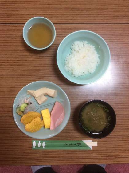 メニュー。ハム、卵焼き、ナゲット、高野豆腐、春雨サラダ、味噌汁。