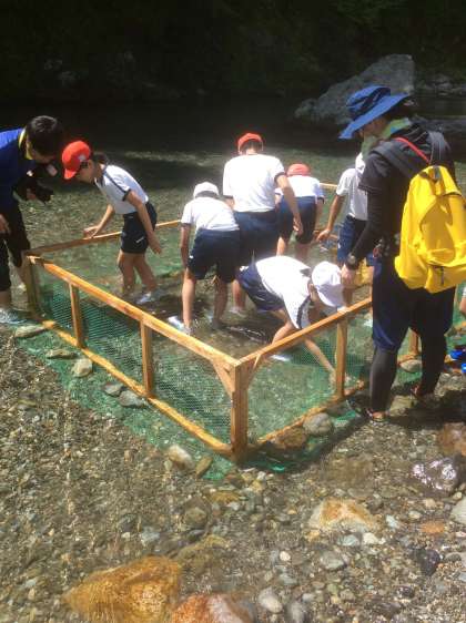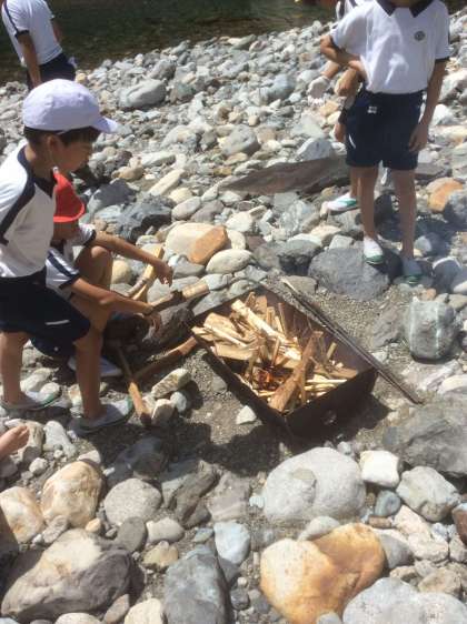 準備の合間に魚つかみ。火の係は、まきの組み方を工夫して火が勢い良く燃えるようにしています。