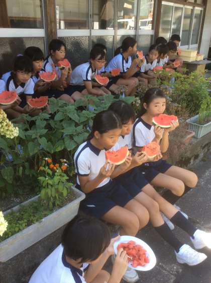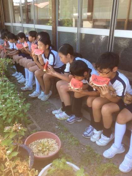 おやつタイム、スイカです。冷たくて甘いです。