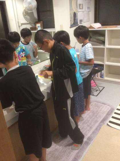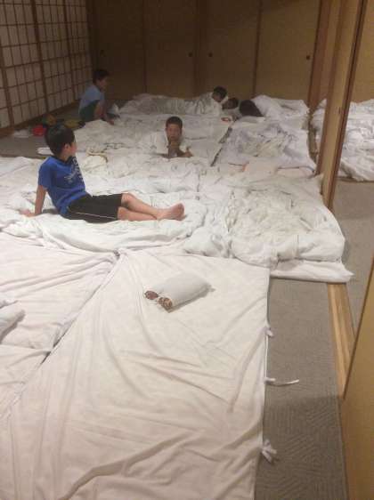 就寝準備をしています。昨日に比べて短時間で布団を敷くことができました。
