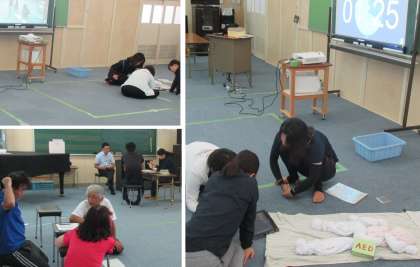 今日は救急対応研修会がありました。プールでの緊急時対応についてのシミュレーション実習を行った後、グループごとに気付いたことなどを話し合い、最後に全体で課題等を共有しました。