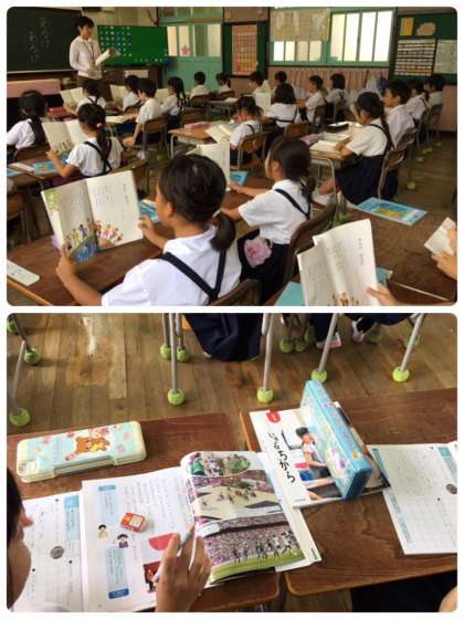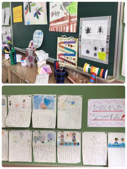1年A組の教室からは、元気な声で音読が聞こえてきました。二学期もがんばっています。1年B組からは、道徳の学習中。自分の意見を友達に伝えたり、書いたりしてがんばっていました。教室後ろには、夏休みの作品がいっぱい。たのしかった思い出がかかれた絵日記やいっしょうけんめい作った図工作品がならんでいました。