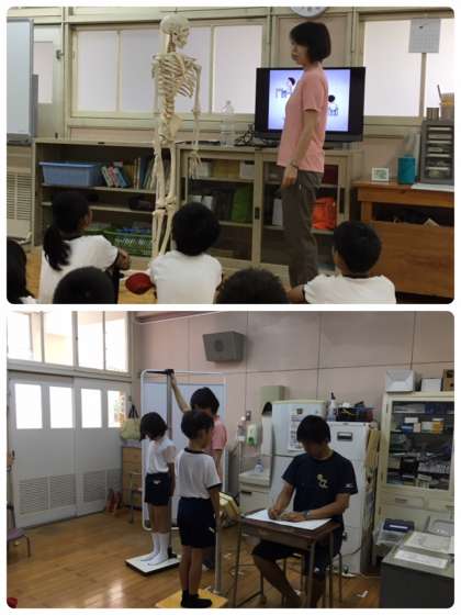 新学期になり、発育測定が行われています。夏休みの間体の変化はどうかな。伊藤先生から正しい姿勢の大切さについてお話がありました。ガイコツもでてきましたよ。骨のつくりについて教えてもらいました。