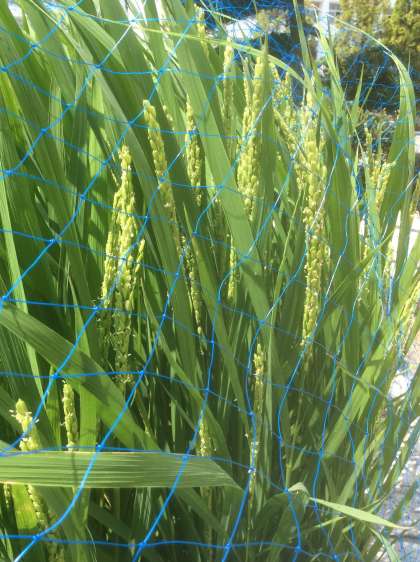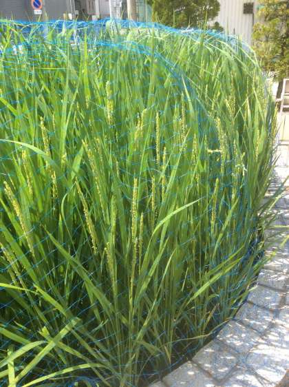滝川幼稚園の水田では、稲が大きく育ち、花が咲き始めました。小さくて花びらが無い目立たない花です。どれが花か分かりますか?