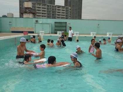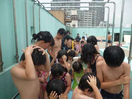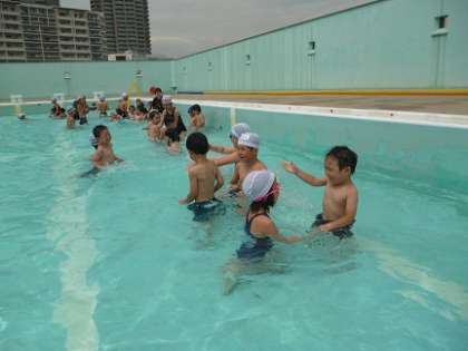 2日本校5年生と滝川幼稚園ばら・さくら組でいっしょにプールに入りました。本校では、各学年で幼小交流の取り組みが行われています。5年生は、先日のガッツ交流に続いて2度目の交流になります。幼稚園児は、プールが2回目だということで、初めのシャワーで泣き出す子もいましたが、5年生のリードのおかげで、楽しく安心してプールに入ることができました。小学校のプールは、広く大きい、そしてやさしいお兄さんお姉さんがいるところだということがよくわかった1日でした。とても楽しかったそうです。