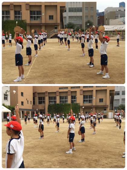 3,4年生の団体演技の練習が外で始まりました。太鼓(てーく)を使ってダイナミックに動きます。