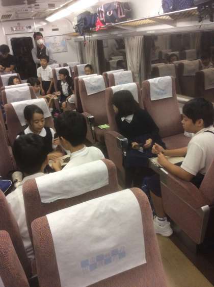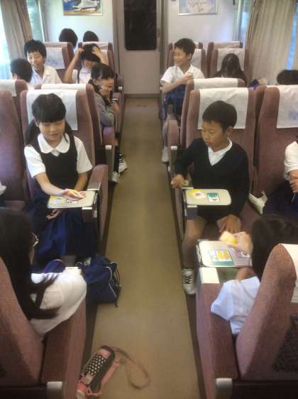 電車の中では、カードゲームやおしゃべりで楽しんでます。