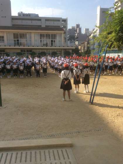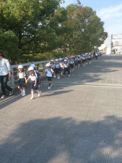 まずは、学級毎に運動場に集合して「始めの会」。その後、地下鉄の駅まで歩きます。
