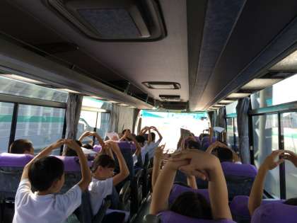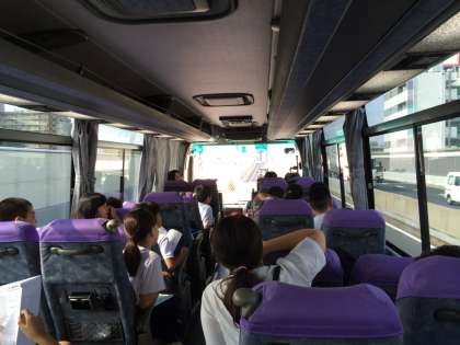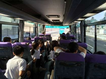 阪神高速に入り、バスレクの開始です。司会の素敵な声で始まり、○×クイズをしています。