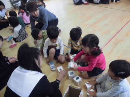 手作りのおもちゃも持ってきて、一緒に遊んでくれました。園庭でも元気に遊びました。とっても楽しいふれあいができました。