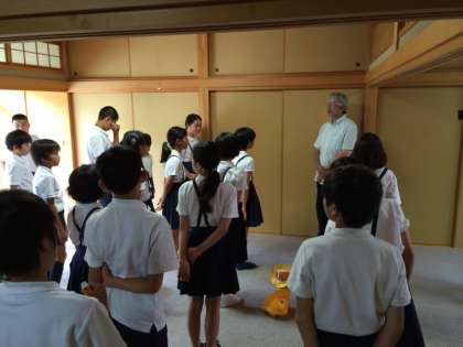 閉舎式での校長先生のお話。きっと目標が守れて楽しくできましたというお褒めの言葉だろうと思います。